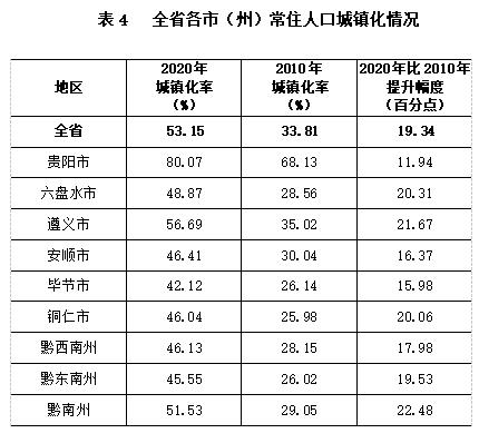 全省常住人口中,过去十年我省城镇人口增加874.82万人,城镇化率提高19.34个百分点,年均提高1.93个百分点,比上个10年(2000-2010年)提升幅度高9.49个百分点,是我省历次人口普查中提升幅度最高的十年。过去十年城镇化率提升幅度高于全国5.13个百分点,我省城镇化水平与全国的差距进一步缩小。过去十年,我省乡村人口减少493.25万人,减少的人口约为安顺市常住人口的2倍,超过贵阳市常住人口的八成。