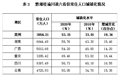 从周边省份来看,城镇化率最高的重庆为69.46%,比十年前提高16.43个百分点;湖南为58.76%,提高15.46个百分点;四川为56.73%,提高16.55个百分点;广西为54.20%,提高14.18个百分点;云南为50.05%,提高14.85个百分点。与周边省份相比,我省城镇化率提升幅度最高,目前正处于赶超进位阶段。