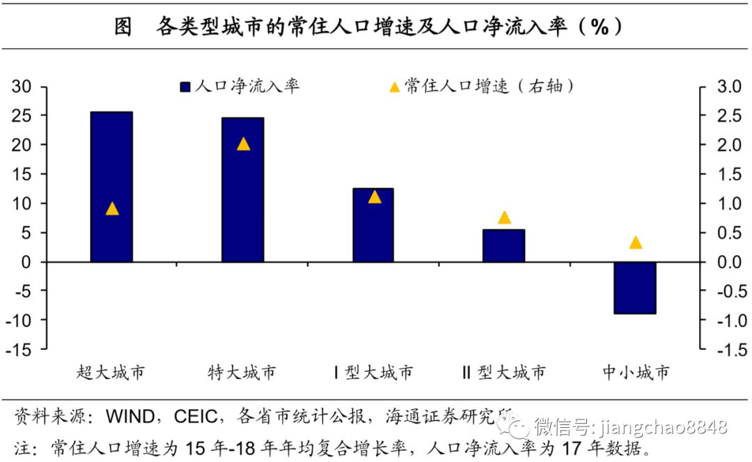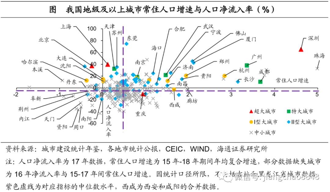广深表现突出,强二线批量崛起。最后,从具体城市看,深圳在全部城市中表现最为突出,17年人口净流入率达65%,15年-18年年均复合人口增速为4.6%,均在所有城市中居于前列。一线城市中的广州同样在两个维度上均有较好表现。同时,强二线城市正在批量崛起,对外来流动人口的吸引力逐渐提升。比如杭州、成都、长沙等二线城市近年来常住人口增速远高于城市中位数水平。此外,东北除省会和计划单列市外的不少城市,以及中西部的部分非中心城市,可能正面临着常住人口收缩的困境,比如四川的内江、资阳,河南的周口、湖北的荆州等。