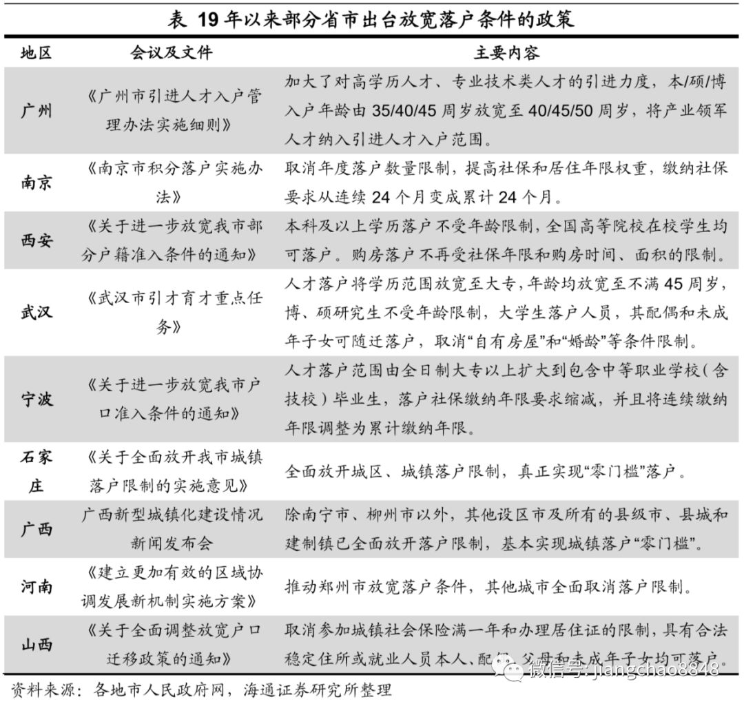 地方政策频出,落户限制松绑。事实上,在发改委《2019年新型城镇化建设重点任务》颁布前后,多地已经陆续出台放宽户籍限制的政策措施,旨在为以往的落户限制松绑。比如河北省会石家庄发布《关于全面放开我市城镇落户限制的实施意见》,真正地实现“零门槛”落户,河南省在《建立更加有效的区域协调发展新机制实施方案》中指出要推动郑州市放宽落户条件,其他城市全面取消落户限制。即便是在广州、南京等一些特大城市,对于外来人口特别是高学历人才落户的限制也有不同程度的放宽。