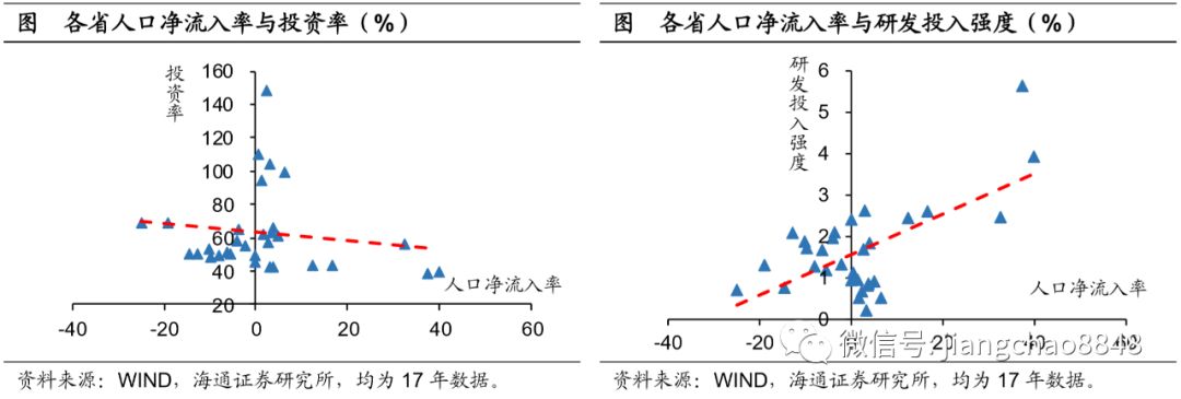 创新驱动产业结构调整。美国的城市发展经验也证实了,人口最终会抛弃传统行业,向创新产业聚集地汇集。在我国,随着经济结构的转型,各省人口净流入率与投资率间相关性已较低,甚至存在一定的负相关。而人口净流入率与研发投入强度间则存在较明显的正相关性。比如深圳在教育和医疗资源上并不占优,但对流动人口的吸引力遥遥领先,其根源就在于较强的创新能力,诞生了一批如腾讯、华为等新经济的龙头公司,而像东北等传统产业大省却面临严重的人口流出困境。