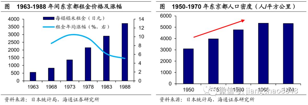 日本东京都市圈:人口持续流入,密度不断增加。再以东京都为例,人口持续流入使得其人口密度不断增加,1950年仅有3000人/平方公里左右,而1965年已超过5300人/平方公里,其后一直保持在这一较高水平。由于城市土地资源有限的约束,人口持续流入势必带来房屋价格的攀升,加剧了经济活动的成本。1963年,日本东京都地区每榻榻米的平均租金价格为550日元,1968年已涨至827日元,年均增速高达8.5%,68-73年间的年均租金增速更是超过10%。