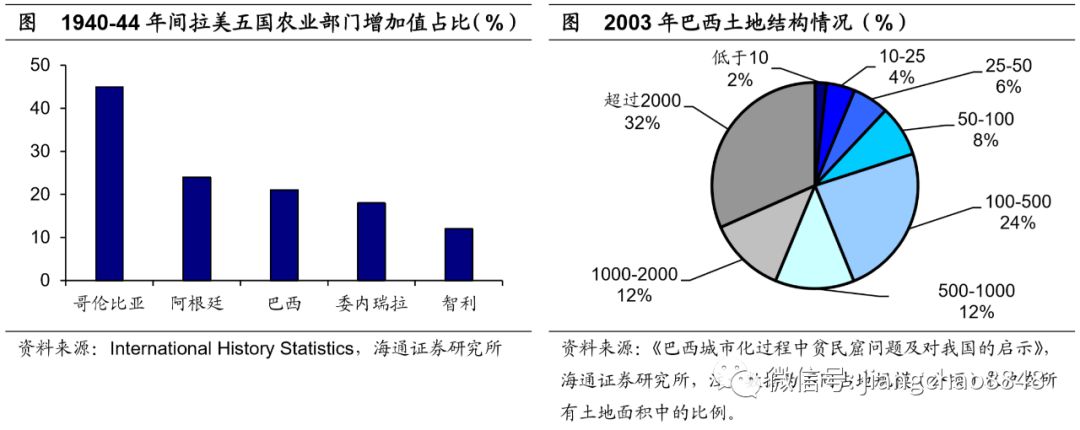 土地高度集中,贫困人口增加。1940年代初,农业仍是拉美经济中最基本的生产部门,阿根廷、巴西的农业增加值占GDP比重均在20%以上,哥伦比亚更是高达45%,委内瑞拉和智利也都超过10%。但是拉美国家土地占有情况极不均衡,土地主要集中于寡头势力而非多数农民手中,导致农村贫困人口不断增加。这一问题始终没有得到缓解,以巴西为例,03年其土地构成中,占地面积超过2000公顷的大农户仍占据全国土地面积接近三分之一,而占地面积不足10公顷的农户所拥有的土地面积仅占2%。