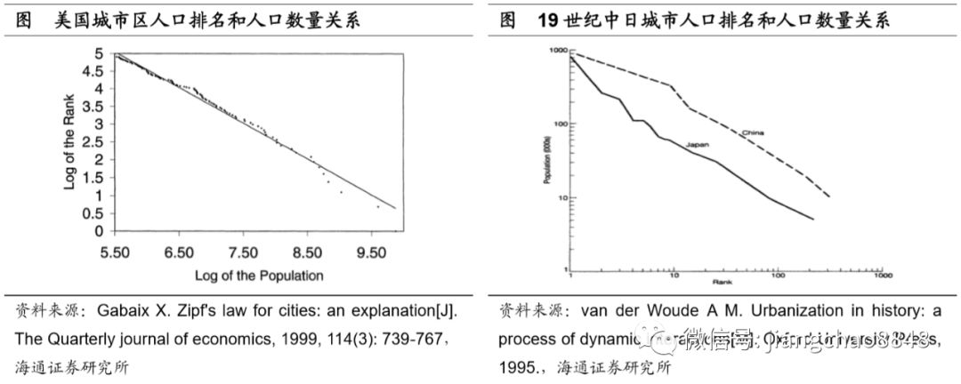 发展普遍规律,人向“大城”迁移。从国际上主要国家的发展经验来看,人口存在向大中城市群集中的普遍规律。城市经济学中的齐普夫定律,揭示了国家内城市规模的分布,即一个国家第N大的城市人口,是首位城市人口数量的1/N,此时取对数后的城市人口排序和人口规模存在负相关关系,散点图呈斜向下直线。这一法则已被证明符合大多数国家以及不同历史时期的城市规模分布情况。它表明由于规模效应完全补偿了边际成本递增,大城市的增长速度并不会比小城市慢。